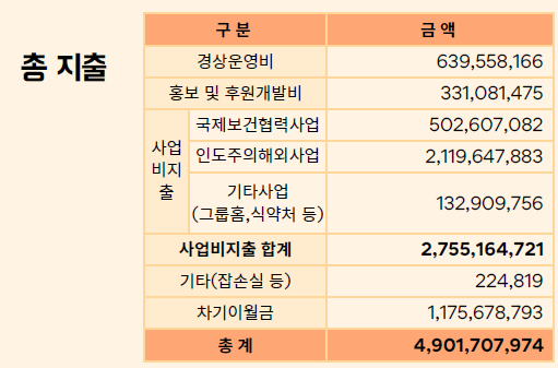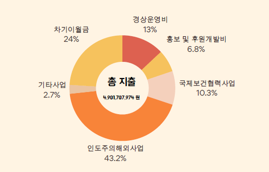 2023년 보건의료 소외 계층의 건강할 권리를 위해 총 지출의 60.4%를 사용하였으며 경상운영비로 11.1%를 사용하였습니다.