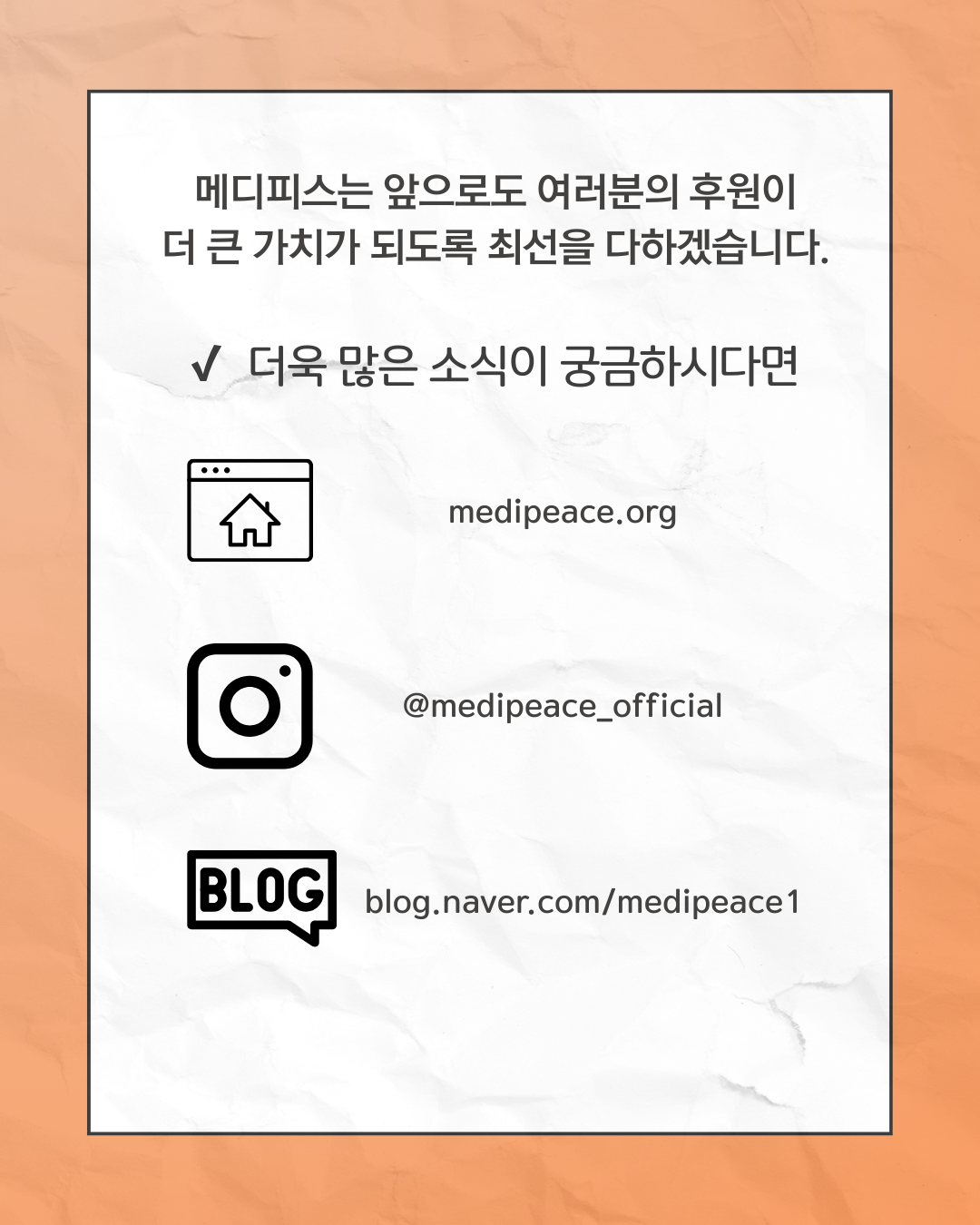 메디피스는 앞으로도 따뜻한 마음을 나누어주신 여러분의 후원이 더 큰 가치가 될 수 있도록 최선을 다하겠습니다.