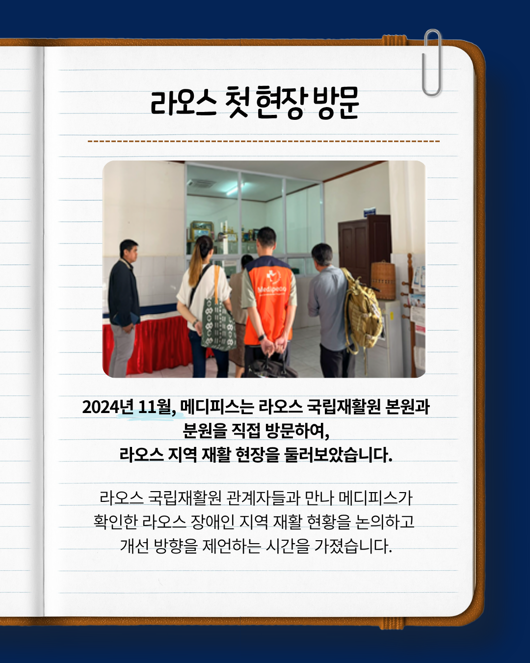 2024년 11월, 메디피스는 라오스 국립재활원을 방문하여 라오스 지역 재활 현장을 둘러보았습니다.
