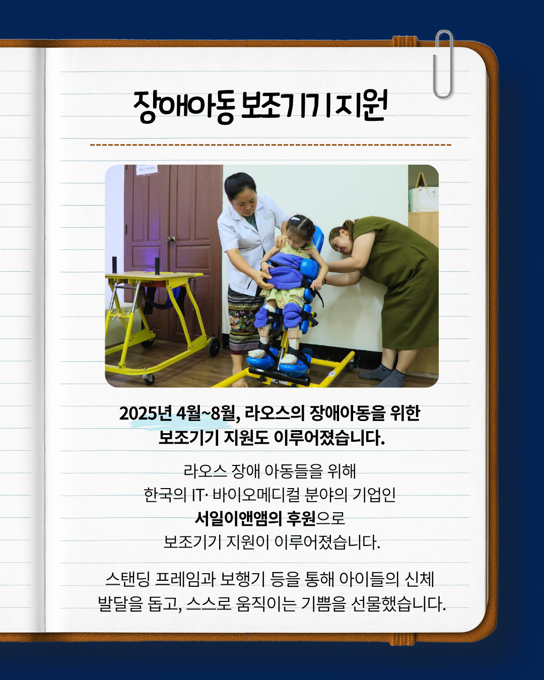 IT, 바이오메디컬 분야의 기업인 서일이앤앰의 후원으로 라오스 아이들에게 스탠딩 프레임, 보행기 등 아이들의