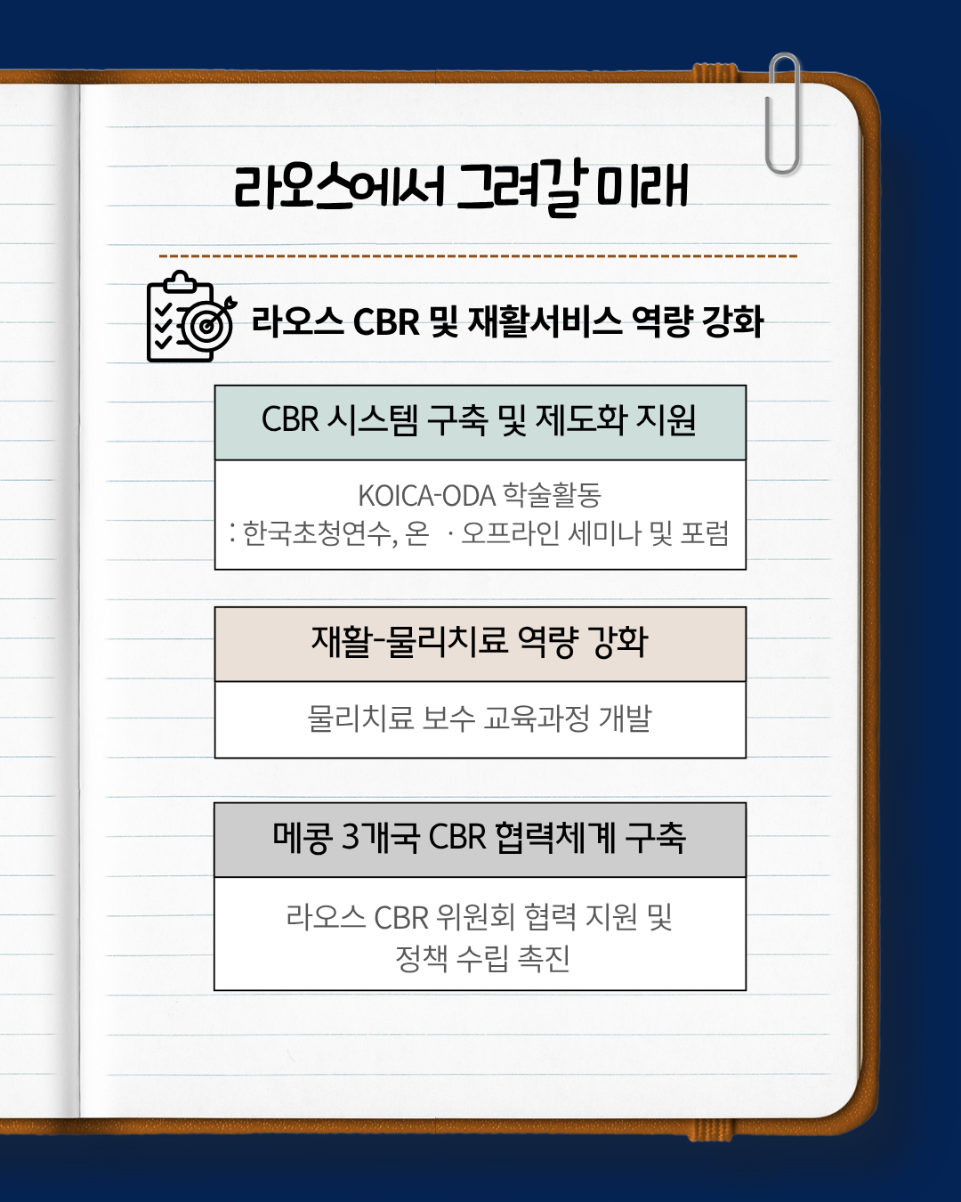 수요가 많았던 재활 물리치료 역량 강화와 함께 메콩 3개국의 CBR 협력체계 구축을 위해 노력하겠습니다.